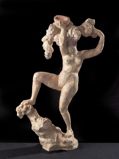 Hanchement marqué, modelé heurté, tension dynamique des masses : la Bacchante incarne l’ivresse du cortège dionysiaque. Les rehauts de polychromie ajoutent à la « sauvagerie » de cette idole moderne.