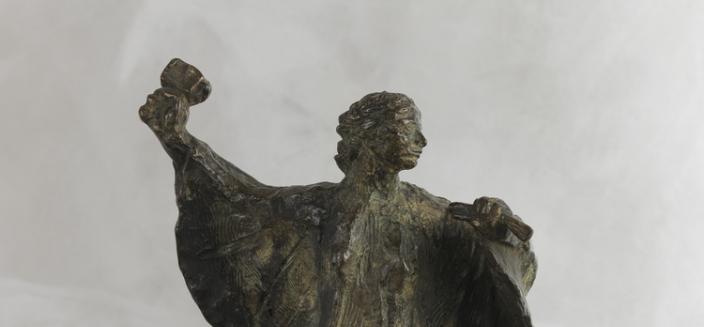 Jusqu’à la fin du 19e siècle, la sculpture – art salissant, physique et technique –, était considéré comme un art ne pouvant être pratiqué que par des hommes, à de très rares exceptions près. La représentation de sculptrices est donc particulièrement inhabituelle. Alors qu’elle est encore l’élève de Bourdelle, Cléopâtre Sévastos devient le modèle de trois œuvres qui affirment son statut de sculptrice : Femme sculpteur au repos, Femme sculpteur au travail et Femme au compas. Conçues comme une série, ces variations dévoilent trois moments successifs de la création et des outils associés : maillet ou massette, pointe et compas. Loin de cantonner Cléopâtre Sévastos à un rôle de muse, Bourdelle signe une œuvre où la jeune femme engage son corps et affirme le geste puissant de la création par ses bras largement ouverts. Pas d’allégorie, ni de mythe : aucune ambigüité sur l’identité de la jeune femme, dont on reconnait les cheveux tressés et le vêtement, un large châle tricoté blanc qu’elle porte pour dégrossir le marbre.