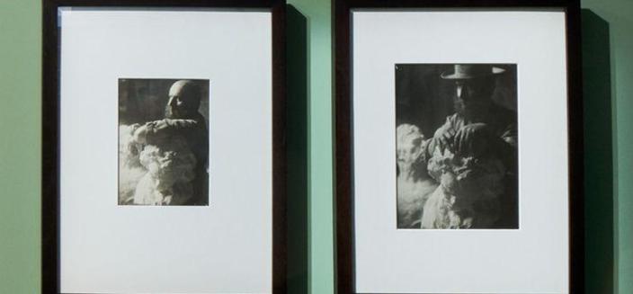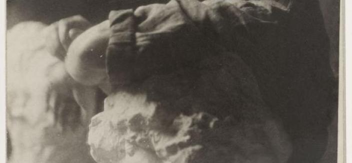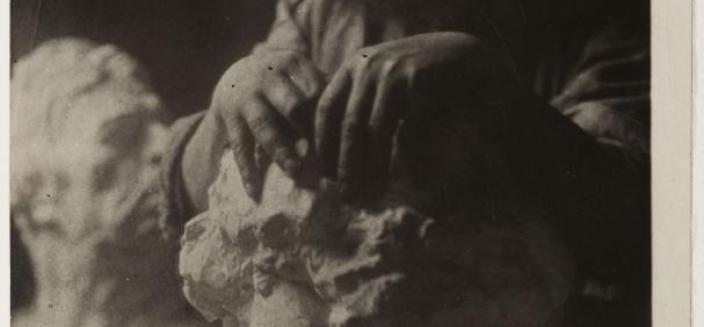 À Montauban, sa ville natale, le tout jeune Bourdelle remarque chez un libraire un portrait de Beethoven avec lequel il partage le front haut, les yeux de feu et la coiffure fougueuse. Physique, l’identification ne tarde pas à devenir artistique. Elle ne cessera jamais, ainsi que l’attestent ces photographies, réalisées vers 1908 : tandis qu’il achève son Héraklès archer, Bourdelle, bientôt cinquante ans, choisit de poser face à un miroir avec deux de ses œuvres – son récent Buste d’Ingres (1908) et, au premier plan, son Beethoven, main appuyée sur la joue (1888), l’une des pièces inaugurales du corpus beethovénien. S’appuyant sur le visage du compositeur comme sur l’épaule d’un ami, Bourdelle compose de splendides autoportraits doubles qui trahissent sa certitude d’appartenir à la même communauté des hommes.