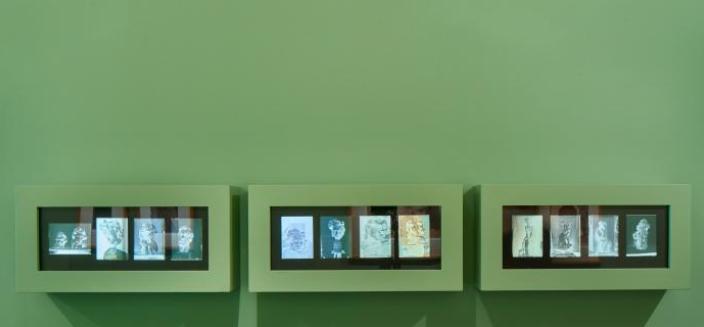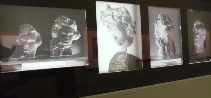 Par la photographie, décisive dans sa pratique artistique, Bourdelle documente et revisite tout à la fois son œuvre. Tandis que certaines prises de vue relèvent de la simple monstration, de l’enregistrement du visible, d’autres représentent Beethoven selon des artifices scénographiques – un socle singulier, un drapé savant, un fond neutre au milieu de l’atelier. Particulièrement fascinantes, les photographies du plâtre du Beethoven aux grands cheveux (1891), dont la blancheur lactée tranche sur le noir crépusculaire, s’amusent avec une impossible lévitation, et rappellent combien Bourdelle, manipulant la figure du compositeur, sut en explorer toutes les faces. Ainsi révélé, un ensemble de douze plaques de verre rend justice à ce que Bourdelle explora des années durant : le surgissement.