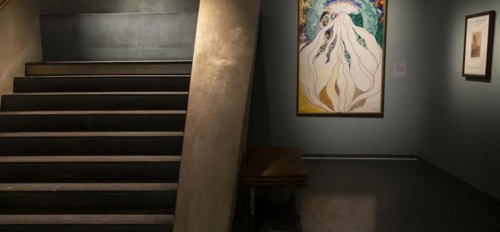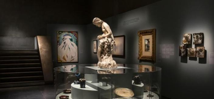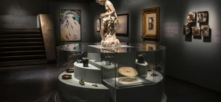 La céramique organique de Jean Carriès et de Hansen Jacobsen, les teintes écumeuses et la matière vitreuse des pâtes de verres de François Décorchemont et de Georges Despret invitent à une méditation sur l’imagination de la matière, à une rêverie sur « l’eau féminine », selon l’expression de Gaston Bachelard (L’eau et les rêves, 1941), et ses mystères. L’opalescence irisée de la pièce du verrieraméricain Louis-Comfort Tiffany évoque irrésistiblement « l’ombrelle vivante » de la méduse aux « fins cheveux qui sont ses organes pour respirer, absorber et même aimer» (Jules Michelet, La Mer, 1875).