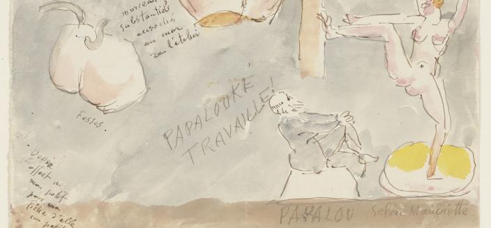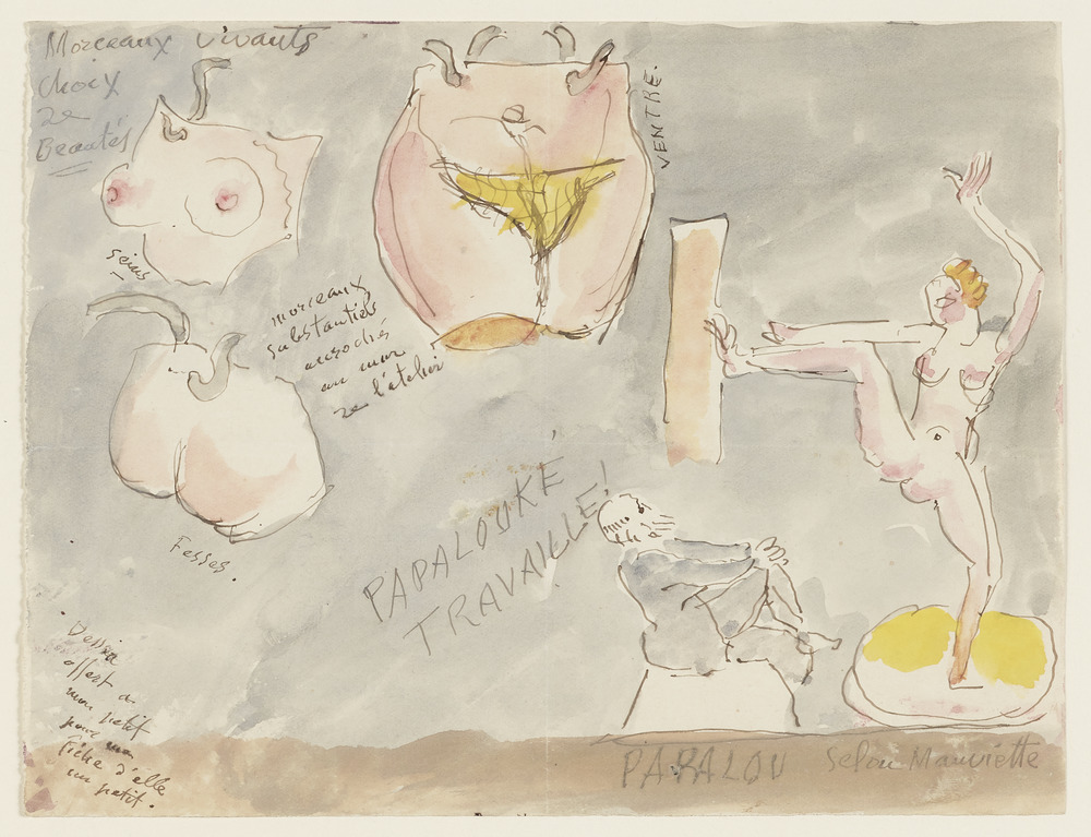 La position de la jeune prêtresse de Bacchus évoque un dessin singulier de Bourdelle, dans lequel l’artiste se représente assis dans une pose décontractée face à un modèle nu, en équilibre, la jambe ouverte, exhibant son sexe devant le sculpteur. « Papalou selon Mauviette », inscrit Bourdelle sous le dessin. Il fait sans doute référence à la jalousie de son épouse Cléopâtre Bourdelle Sévastos, manifestement indisposée par la proximité entre son mari artiste et des modèles souvent peu frileux. Dans le bord supérieur gauche, trois morceaux « vivants », véritables « choix de beautés » (seins, ventre, fesses) sont esquissés, suspendus comme de la viande sur des crochets de boucherie. La sexualité est réduite à l’érotisme du regard. Ces « zones érogènes » crûment présentées dessinent « une physionomie sexuelle et appelle[nt] les gestes du corps masculin », pour reprendre les mots du philosophe Maurice Merleau-Ponty.