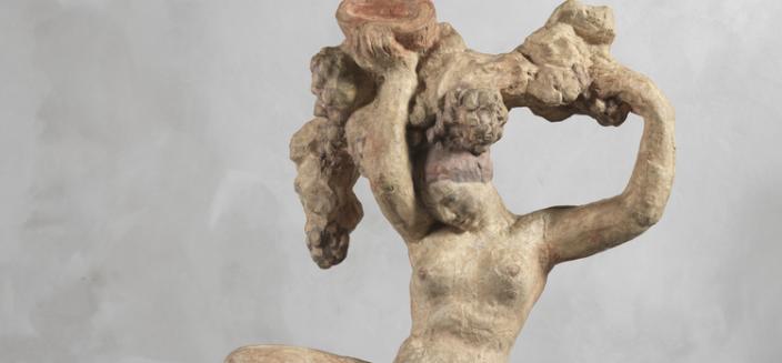 Une bacchante ivre danse et titube sous le poids de grappes de raisins. Dans une nudité que la polychromie relève par touches rosées, la femme s’abandonne à une transe, tandis que son visage affiche une étrange sérénité. La bacchante transcrit une forme d’excès et de sexualité débridée pour les artistes qui réinvestissent sa représentation au 19e siècle. Volontiers menaçante, elle permet aux artistes d’imaginer des poses déséquilibrées, provocantes et suggestives, sous couvert de mythologie.