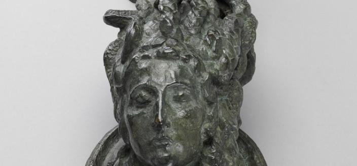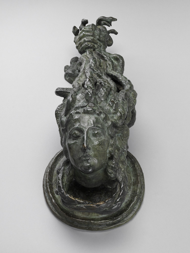 À vocation décorative, le marteau de porte de Bourdelle propose une Méduse belle et apaisée. Loin des dessins noirs de sa jeunesse – dans lesquels la tête de Méduse, édentée et ridée, est une vision d’horreur –, elle présente ici un visage doux et une longue natte qui constitue la poignée d’un heurtoir à saisir. Méduse a les yeux clos. Méduse ne rit pas. Elle est morte. Renversement symbolique : celle qui pétrifiait ceux qui croisaient son regard est désormais à son tour pétrifiée dans l’airain. Il n’y a plus rien à craindre d’elle ; faut-il y voir un monstre rendu inoffensif par la décapitation ? Rejouer le geste violent de Persée en serrant le nid de serpents lorsqu’il s’agit de manier le marteau ? Une autre hypothèse serait de lire, dans ce visage assagi, une dimension protectrice. Comme les marteaux de porte de l’époque romaine, le heurtoir peut désormais se comprendre comme une figure apotropaïque, destinée à protéger le foyer.