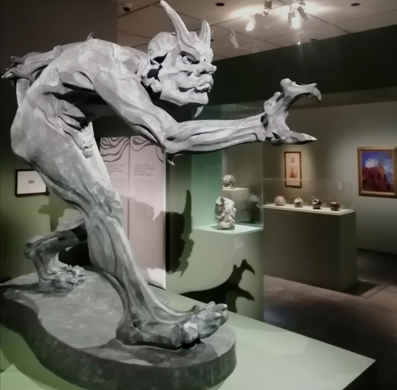 Conçu par Niels Hansen Jacobsen au cours d’un séjour au Danemark en 1896, Troll qui flaire la chair de chrétiens s’inspire d’une figure immémoriale du folklore scandinave. Une queue, des cornes, des serres en forme de pince à trois doigts – déni diabolique de la Trinité du christianisme ? Aux aguets dans la forêt des origines, la créature bestiale renvoie aux pulsions premières et dévoratrices. La logique formelle du Troll naît d’un riche humus de références vernaculaires et plastiques.
